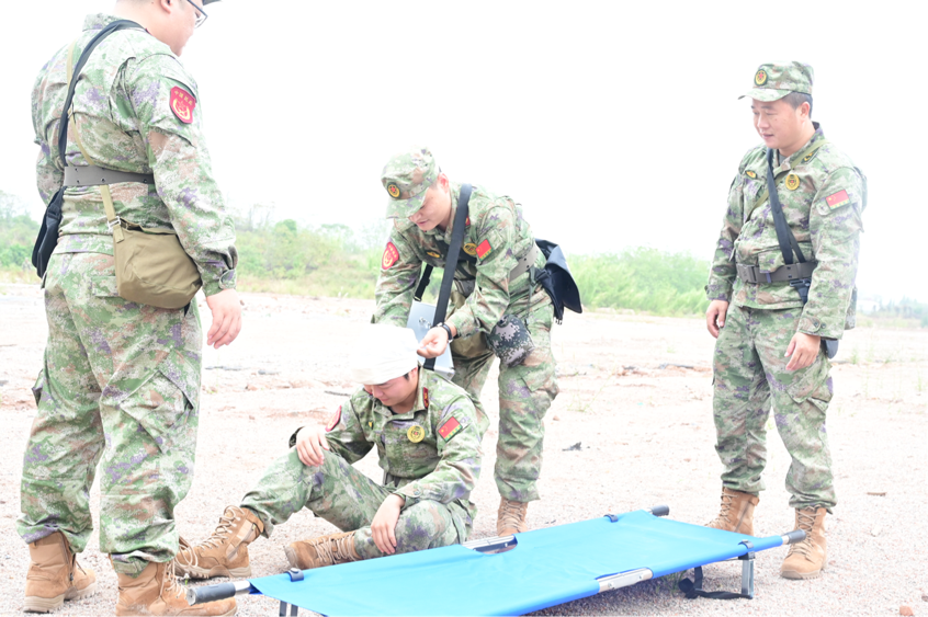 “車隊到達(dá)指定地域后,出現(xiàn)一名傷員民兵,請立即前去救治!”醫(yī)護(hù)救護(hù)組聞令而動,運(yùn)用擔(dān)架轉(zhuǎn)移傷員并現(xiàn)場完成清洗包扎,展現(xiàn)出專業(yè)的戰(zhàn)場救護(hù)與防護(hù)技能。